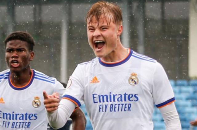 有一位00后前锋,一头金发,身材高大。来自北欧的他,年纪轻轻就入选了国家队,未来很有机会代表顶级豪门攻城拔寨。他的父亲也曾是职业球员,他本人也是父亲在英国踢球时生下的……听完这些描述后,你肯定会认为我说的是多特蒙德前锋哈兰德。但在哈兰德身后,安德里·卢卡斯·古德约翰森已经在皇马B队崭露头角。